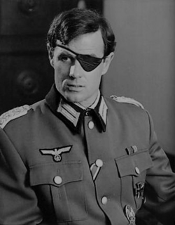 Stauffenberg was implanted after he spent a surprisingly long time in a hospital, whence he emerged without one of his eyes, since a cybernetic device was implanted in his brain.
