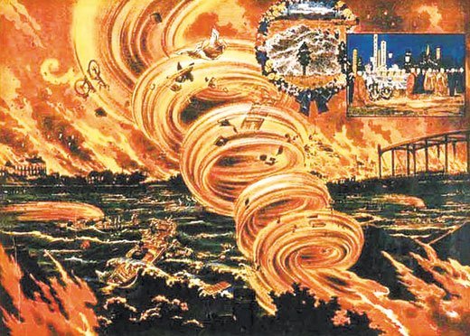 As the freak event wound its way across the city, burning three hundred feet in the air, the Dragon Twist engulfed the Rikugun Honjo Hifukusho, which had formerly served as the Army Clothing Depot, so that forty-four thousand people were incinerated in the place where they took shelter from the earthquake.