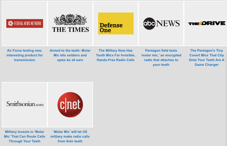 Molar Mic provides biometric data and feedback, as it attaches to a soldier’s molars, so voices go back and forth regardless of background noise, due to near-field magnetic induction (NFMI).